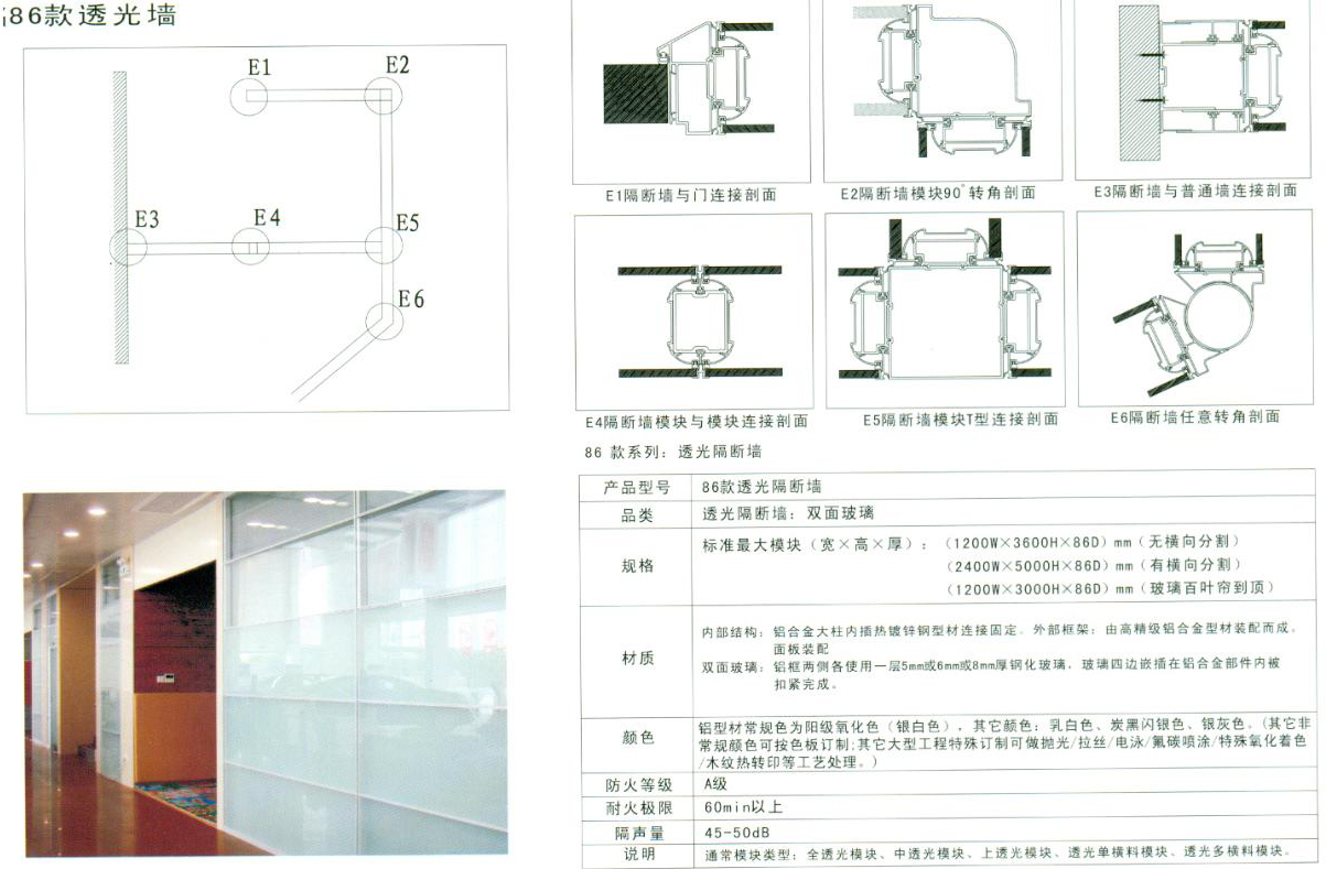 86高隔斷是最為成熟的產品,已經做過很多工程案例,深得廣大客戶認同和喜愛,它的任意拆裝,靈活多變地空間劃分組合,自由吊掛隨意的材質搭配,把辦公空間的藝術之美演繹的淋淋盡致。 鋁框中間橫向壓條為17mm,豎向壓條為13mm,上下槽為65mm,左右壁槽為:65mm,側柱為20mm。