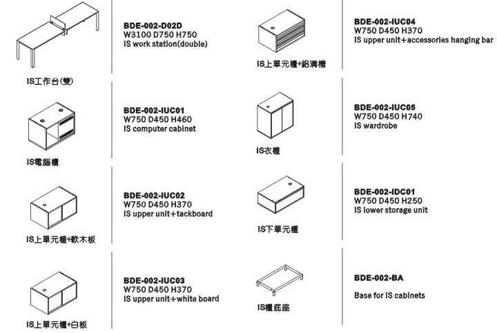單元柜有標準的下文件柜、上文件柜、、電腦柜、衣柜可供配置,上文件柜又有軟木背板、白板背板、鋁溝槽背板可供選擇。